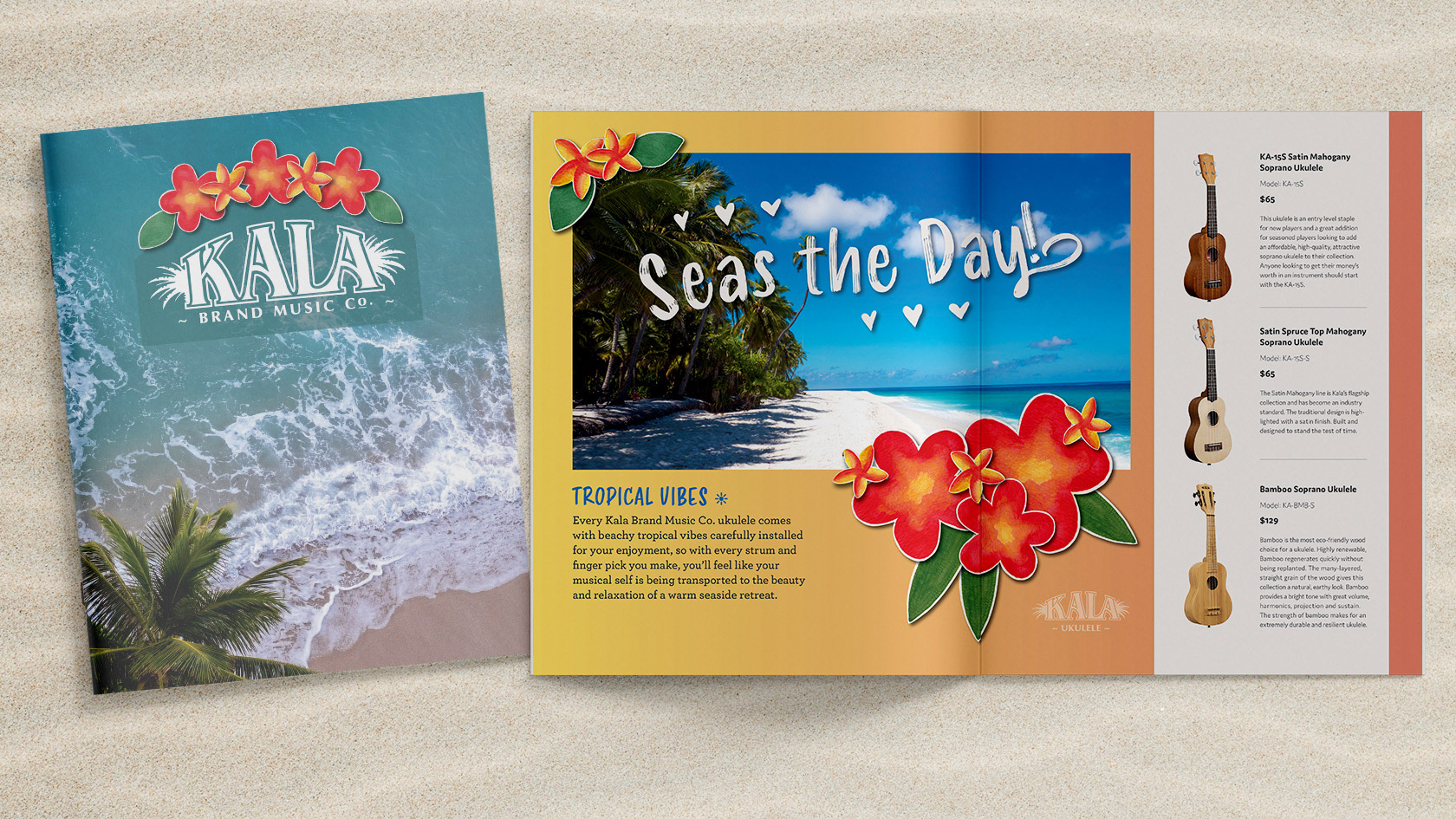 Kala Brand Music Company offers a wide variety of ukuleles for all ages. I designed this brochure to showcase a few of their ukulele designs, bring attention to the starter kits and online lessons available, and share the story of how Kala got started. The flowers throughout the brochure are watercolor paintings I created. I cut around each flower, then photographed and added them to each spread to give the brochure a hand-made tropical feel. Skills: Research, Concepting, Photo Editing, Long Format Typography, Grid Layout, Copywriting Programs: Photoshop, InDesign