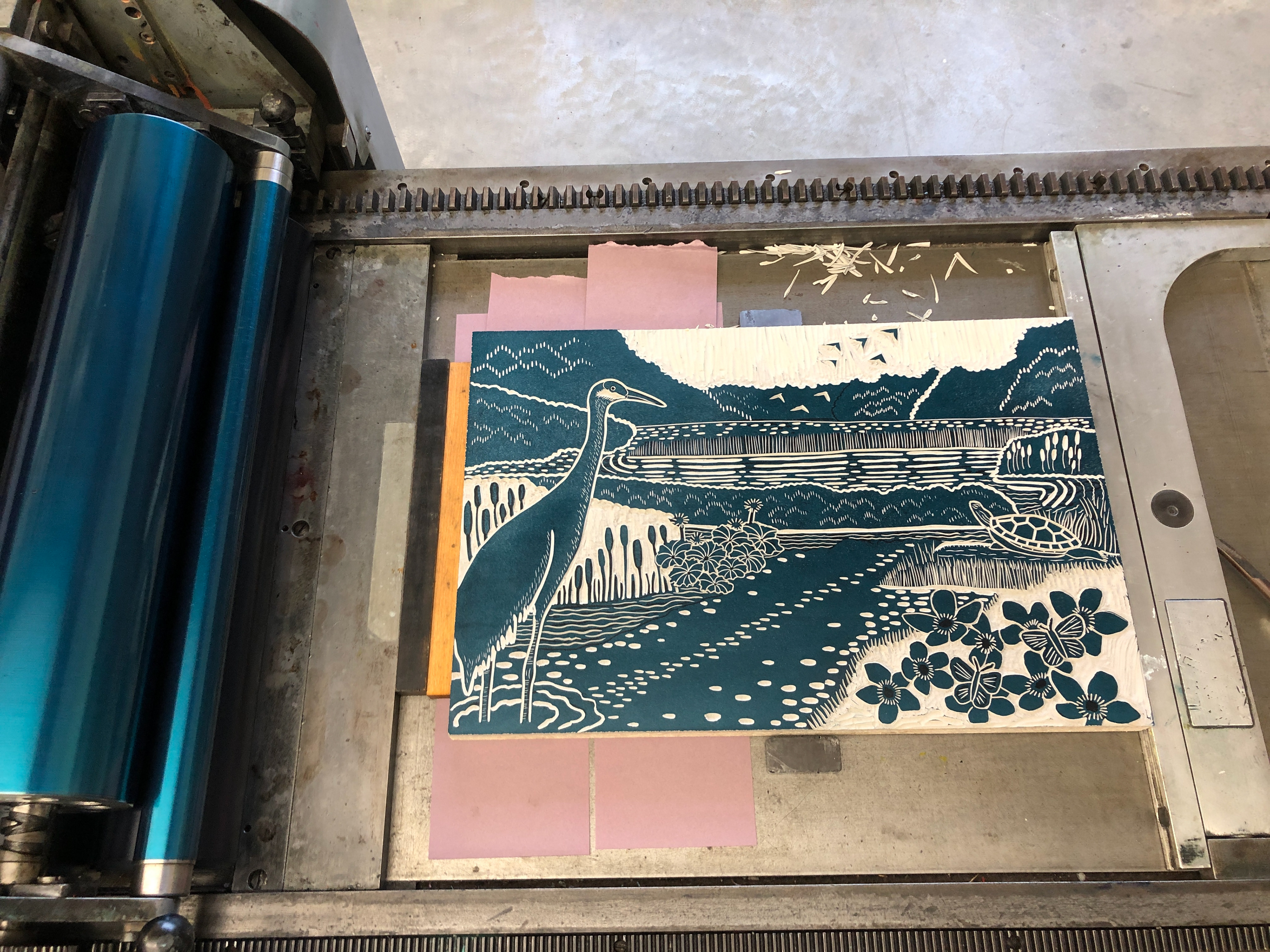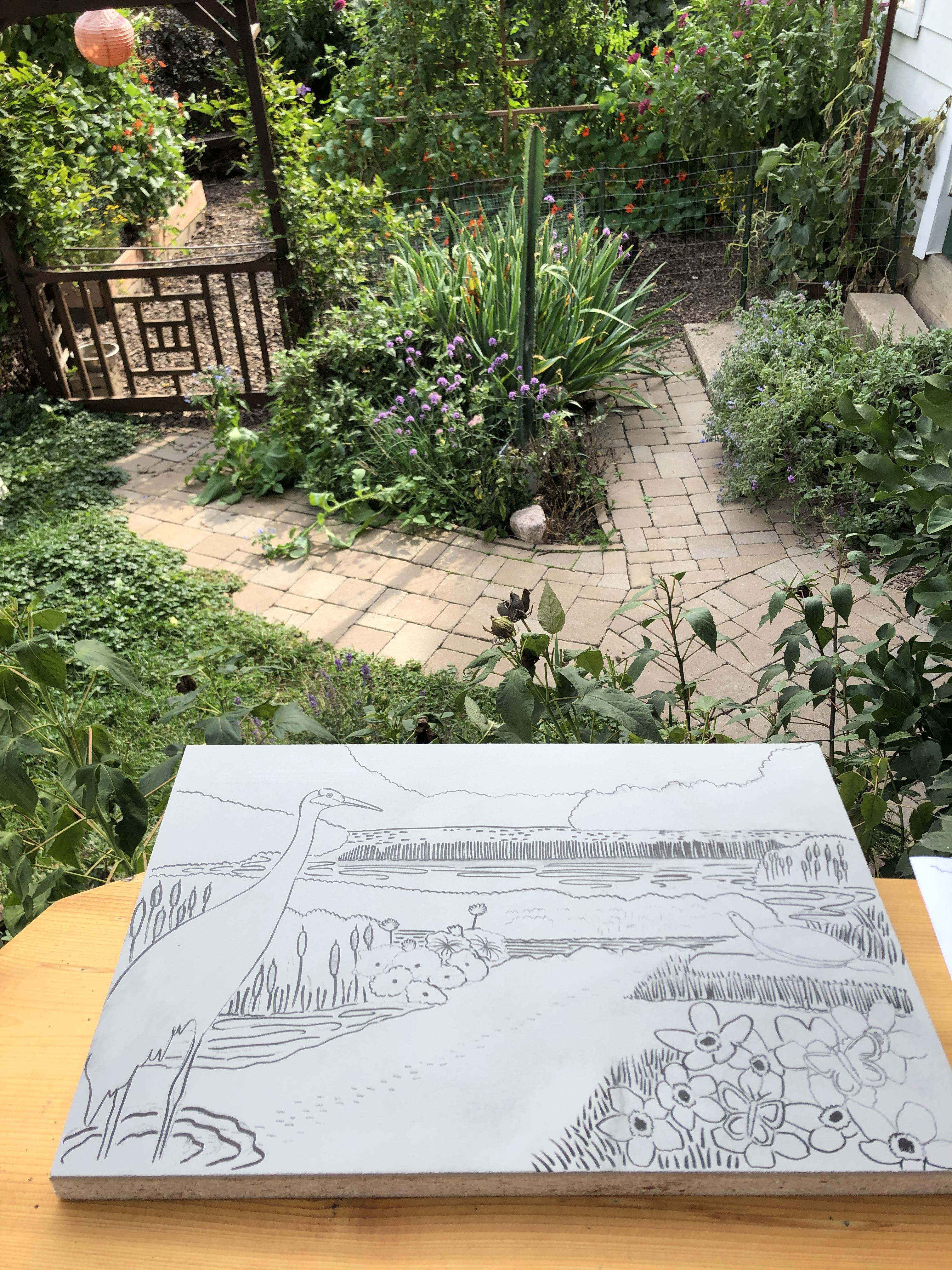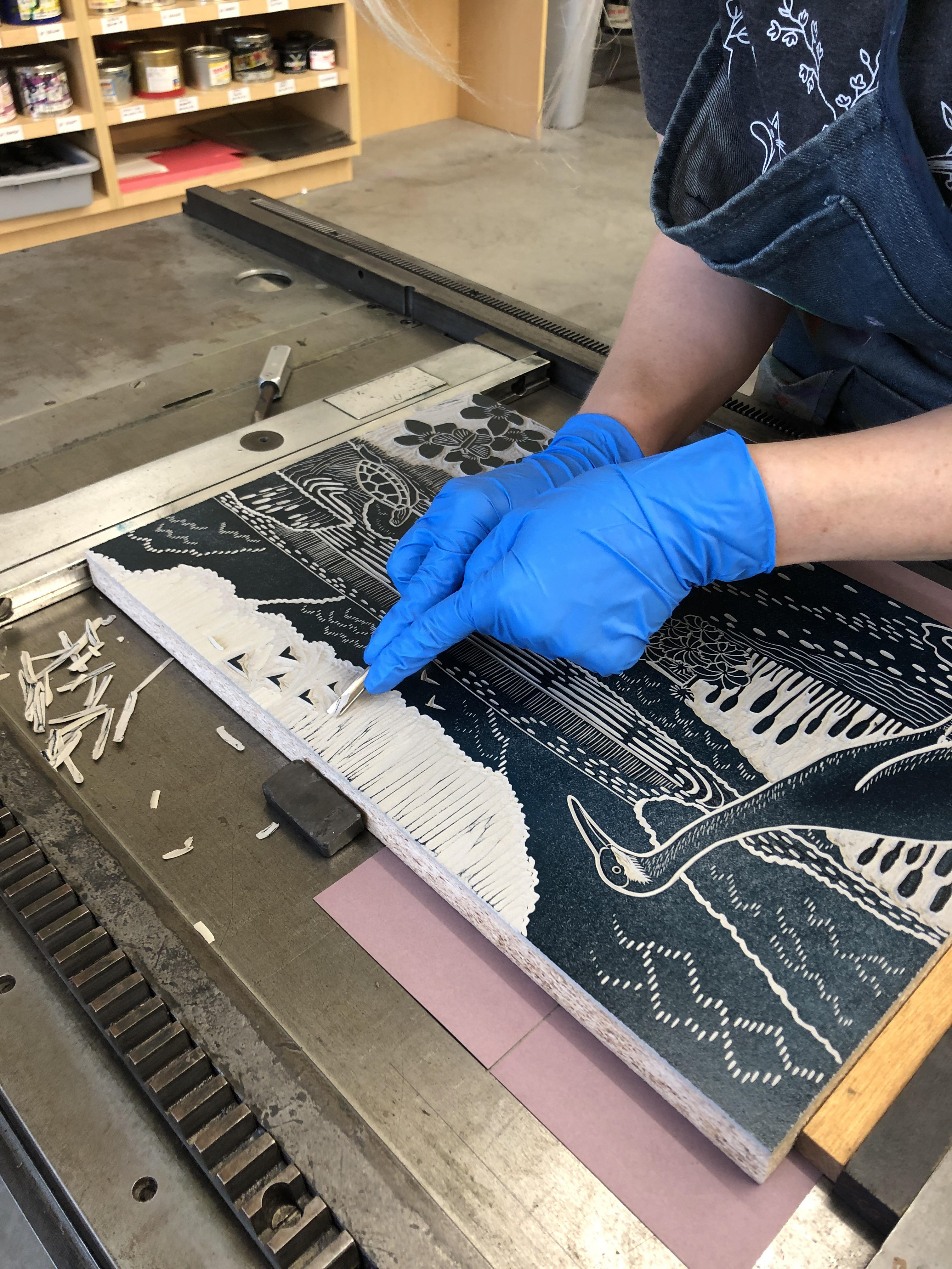 Before I started carving my full-size block, I used two smaller blocks to practice mark-making. I noted the size of the carving tool I used for some of the marks by indicating the number of the tool next to the mark.